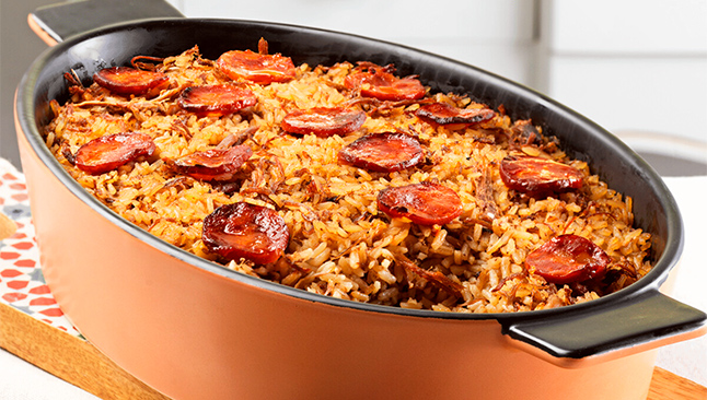 Fiel à receita original, o Arroz de Pato é confecionado no próprio caldo, em conjunto com os enchidos para realçar ainda mais o sabor. As rodelas de chouriço selecionado conferem um aroma único a fumeiro, e fazem deste o prato ideal para servir durante um almoço de domingo em família ou num encontro com amigos. Acompanhe com uma salada de agrião e gomos de laranja para refrescar.