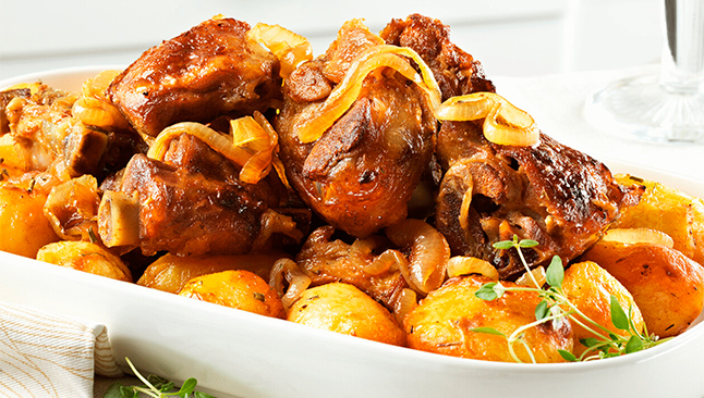 Cabrito assado com batatas assadas