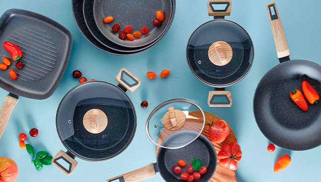 A gama Wood Stone da KASA é composta por frigideiras, caçarolas, grelhadores e woks e combinam funcionalidade com bom gosto. O revestimento antiaderente melhora a confeção dos alimentos, uma vez que permite cozinhar facilmente sem qualquer gordura. O corpo de alumínio extraforte torna cada caçarola e frigideira mais leve, assegurando uma perfeita distribuição de calor à superfície.
