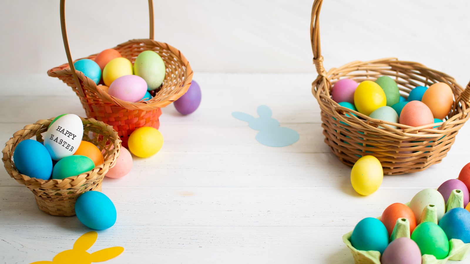 Os cestos também são uma parte importante da caça aos ovos. Prepare um para cada criança, de forma que possam colher os ovos que encontrarem. Os cestos de verga simples são uma boa opção e podem ser decorados com fitas. Em alternativa, reutilize caixas de cartão ou recipientes de plástico e cole uns coelhos de cartolina para animar.