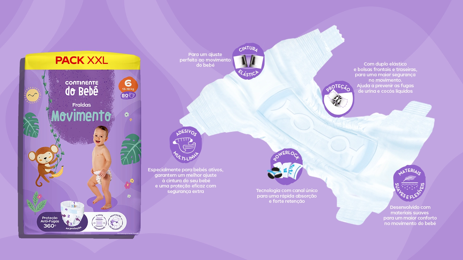 A gama de fraldas Movimento Continente do Bebé foi especialmente desenvolvida para garantir a máxima proteção e liberdade de movimentos, com 4x Proteção Anti-fugas: bolsas traseiras, frontais e barreiras laterais.