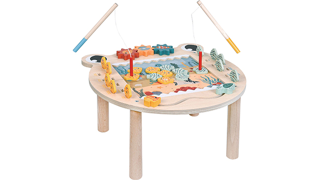 - Mesa de atividades de madeira: a estação de trabalho que ajuda as crianças a estimular a coordenação enquanto fazem de conta que são pescadores.