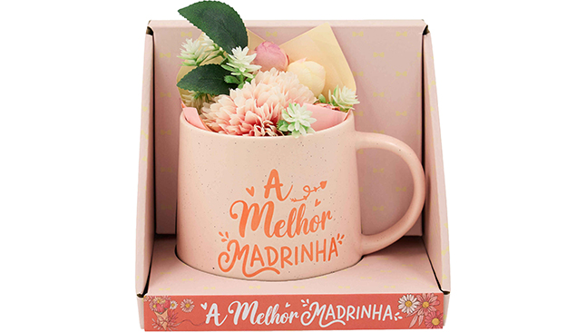 A madrinha que gosta de mimos simples vai adorar esta caneca com flores ou esta com corações dourados. Um presente útil no dia a dia, que a fará lembrar-se sempre do carinho do afilhado ou da afilhada.