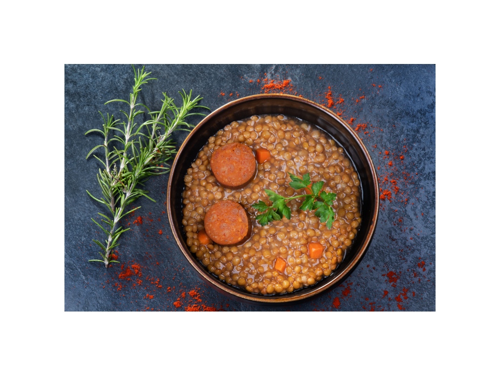 - Lentilhas veganas – lentilhas cozidas com alternativa vegetal à salsicha, cenoura e azeite