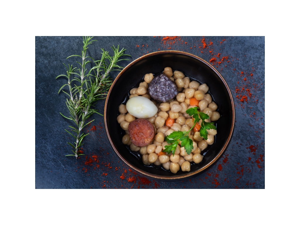 - Grão-de-bico vegano – grão-de-bico cozido com batata, alternativa vegetal ao chouriço e morcela, com cenoura e azeite