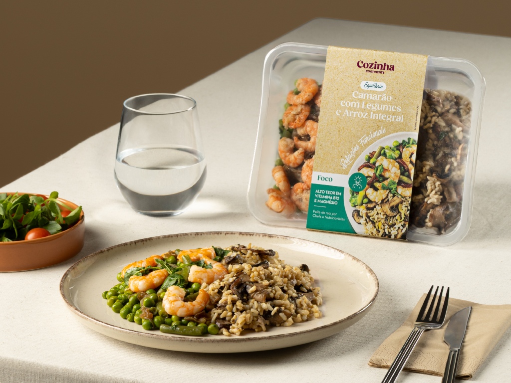 Foco – Camarão com Legumes e Arroz Integral: Uma refeição ideal para quem procura manter a energia! Com alto teor em vitamina B12 e magnésio, que contribuem para o normal funcionamento do sistema nervoso, ajudam a prevenir o cansaço e fadiga, promovendo a concentração.