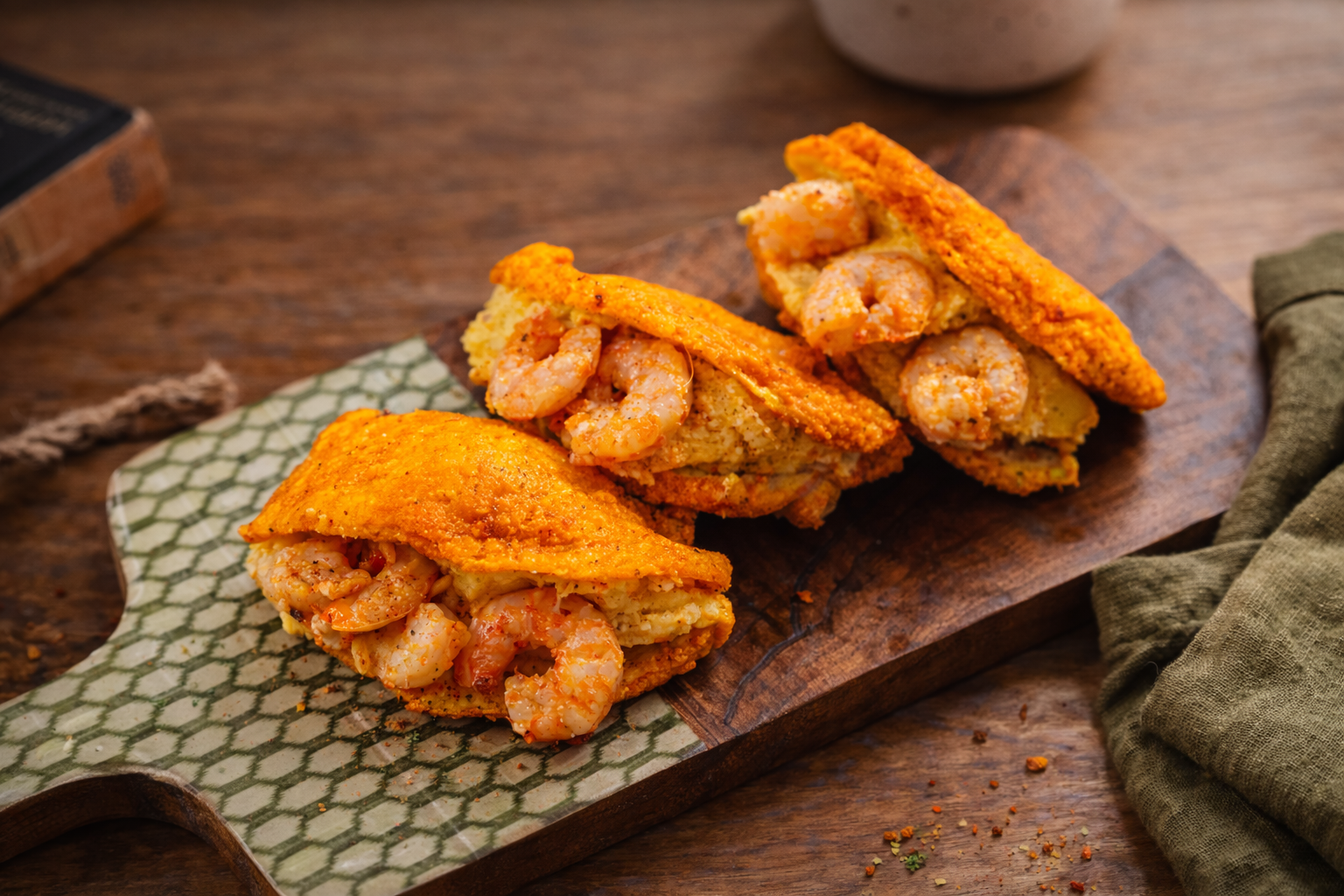 Corte os acarajés ao meio, recheie com o vatapá e decore com camarão grelhado.