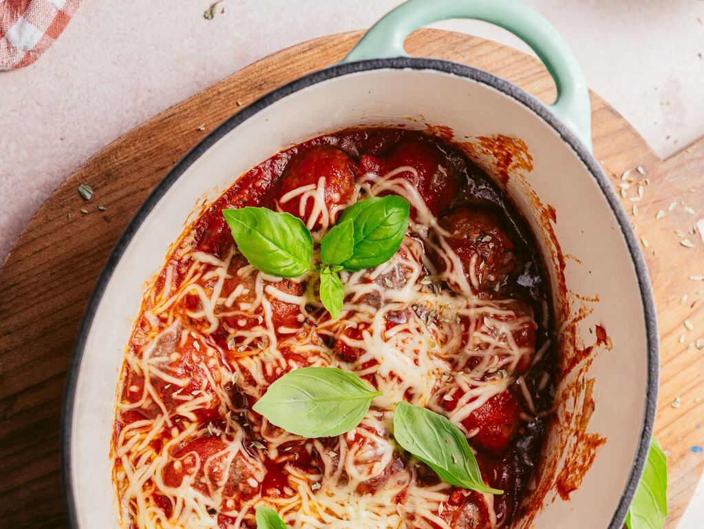 Sirva num prato a massa e coloque por cima as almôndegas com o molho. Decore com manjericão fresco.