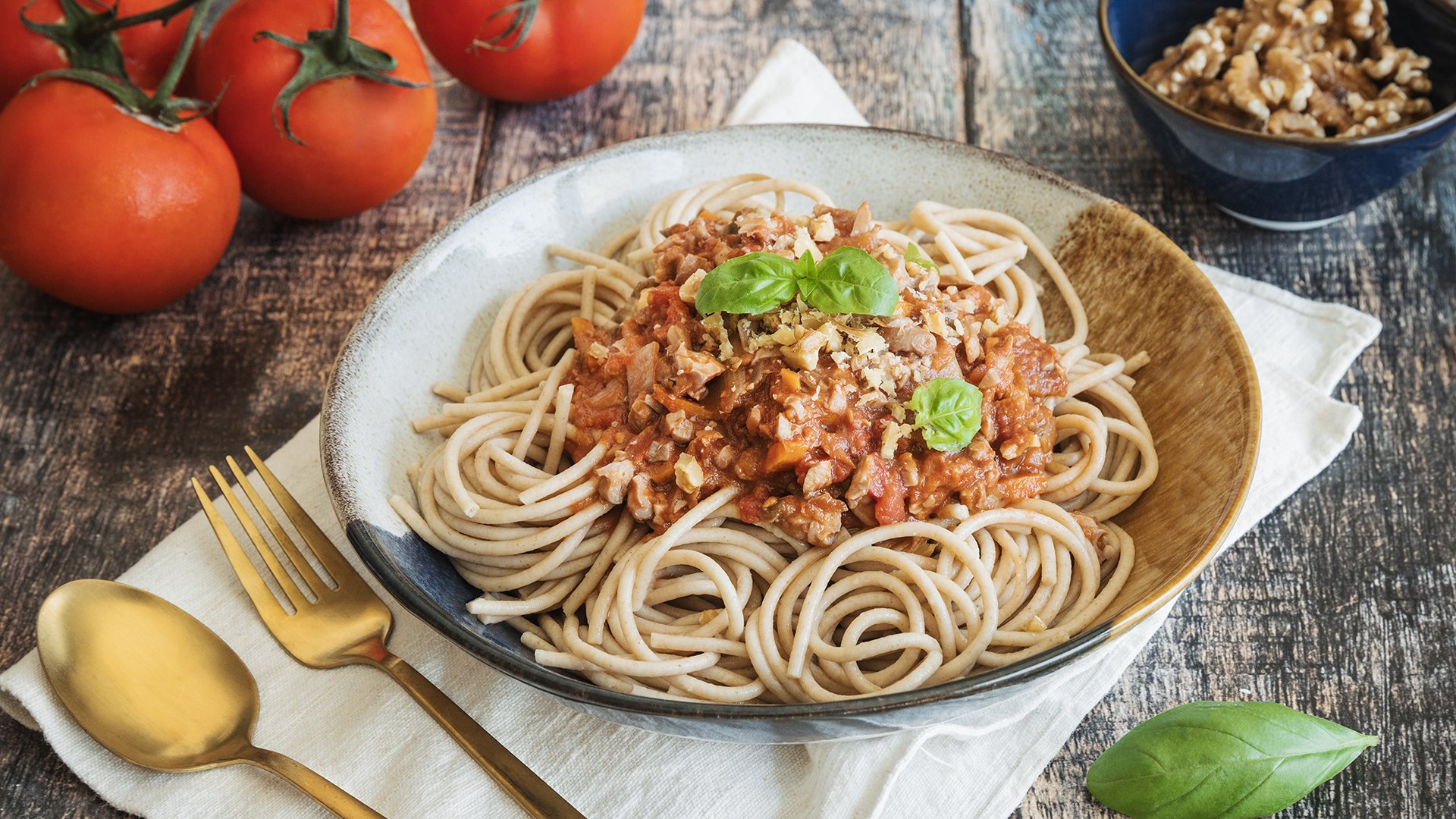 Numa frigideira com um fio de azeite, salteie o tomate durante 3 minutos. Sem retirar do lume, junte a massa e as amêndoas.
