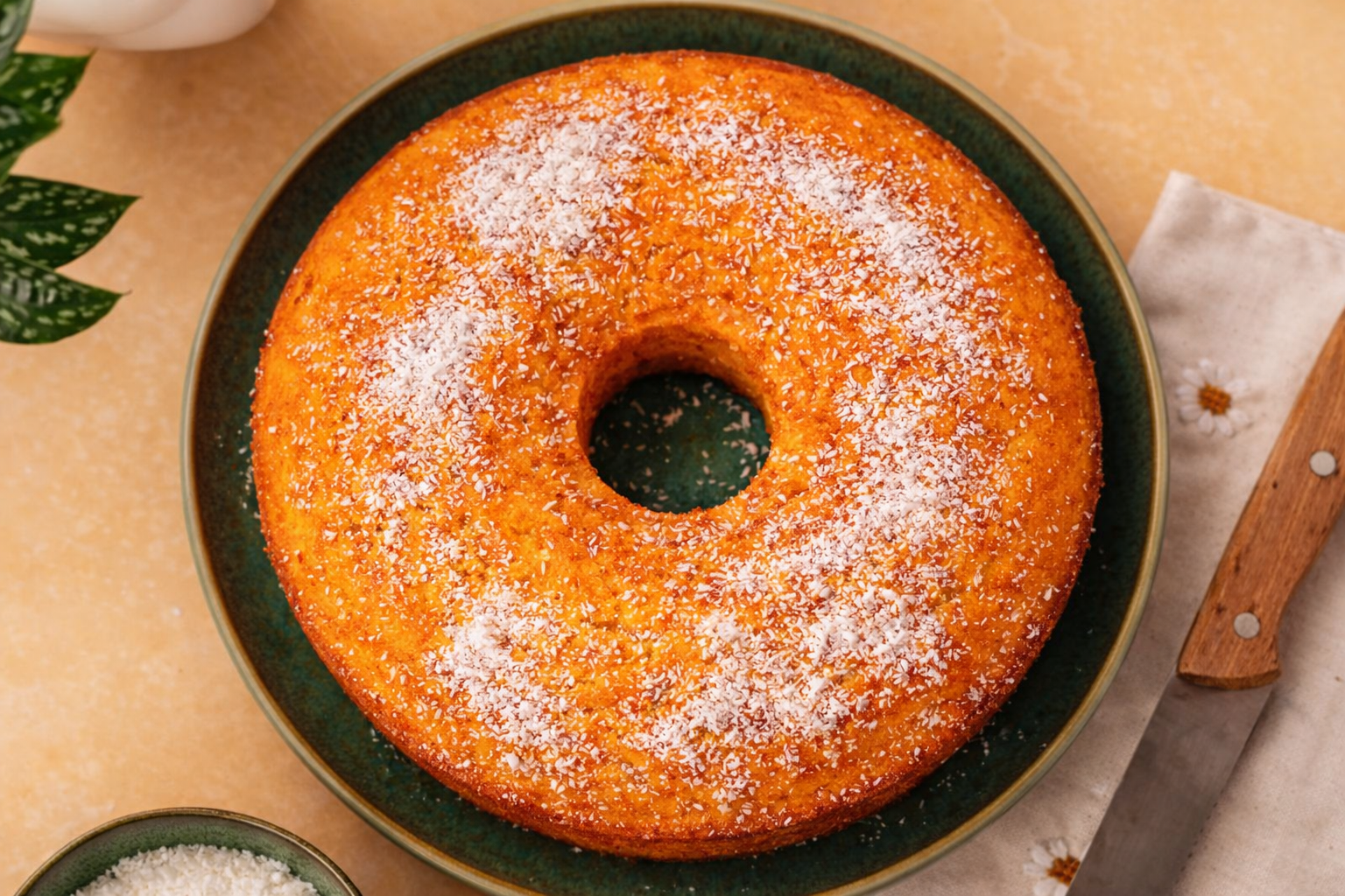 Deixe arrefecer, desenforme o bolo e cubra-o com iogurte grego e coco ralado.