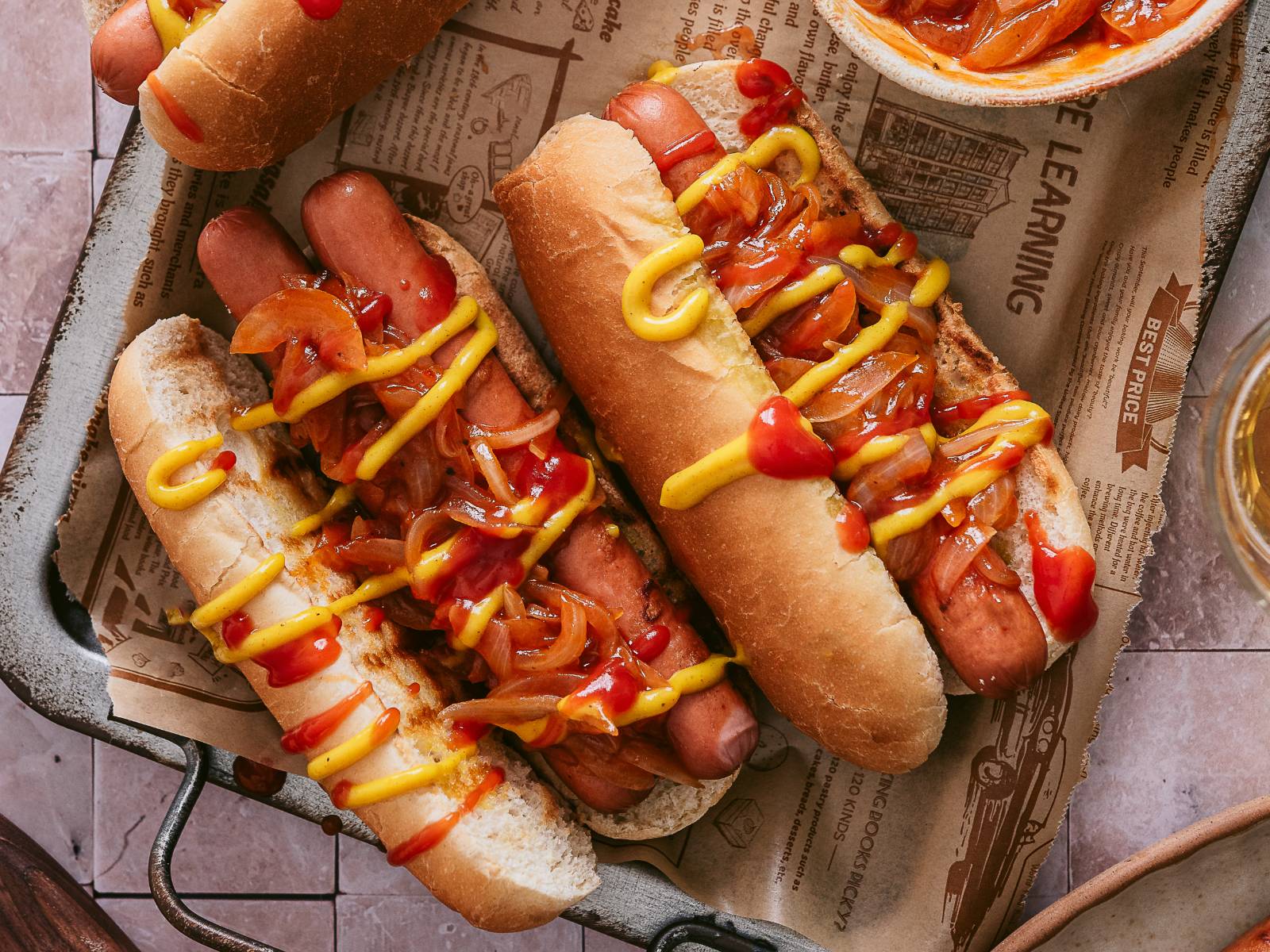 Na montagem do hot dog, adicione primeiro as salsichas, depois a cebola caramelizada e regue com molho mostarda e Ketchup a gosto.
