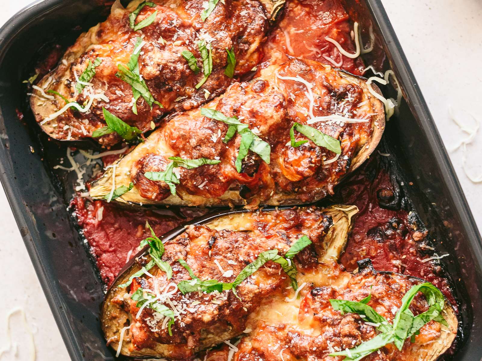 Numa travessa, coloque metade do molho de tomate e disponha os canelones de beringela por cima. Termine com o resto do molho de tomate, esfarele um queijo mozzarella de búfalo e leve ao forno, pré-aquecido, a 180ºC, durante cerca de 25 a 30 minutos.