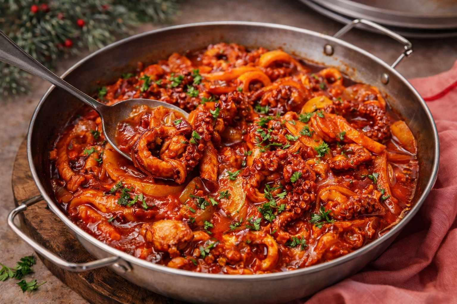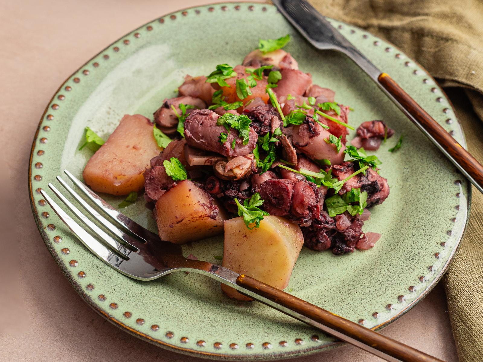 Junte o polvo cortado em pedaços, envolva cuidadosamente e deixe cozinhar em lume brando entre 20 e 30 minutos, para que o molho apure.