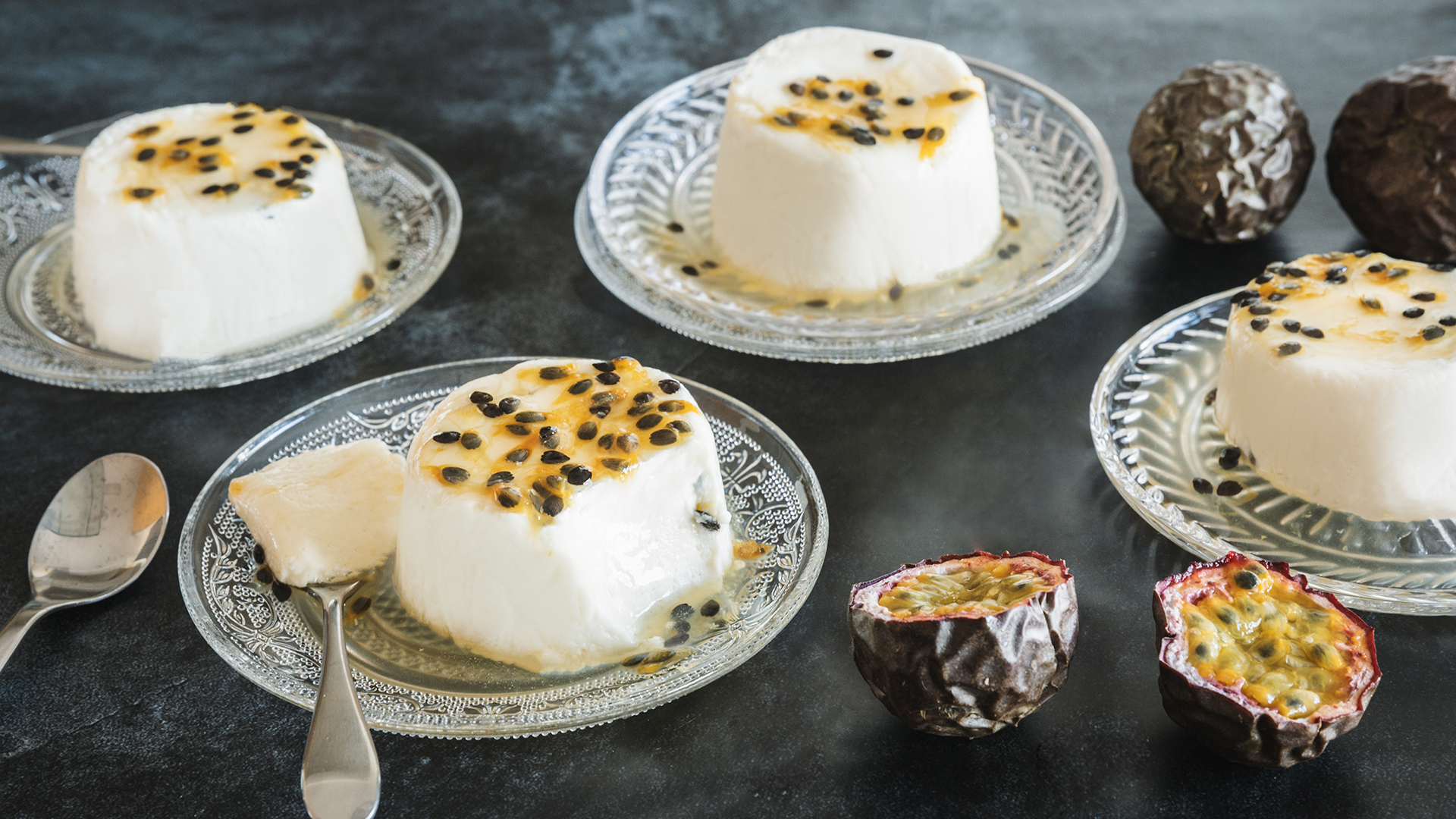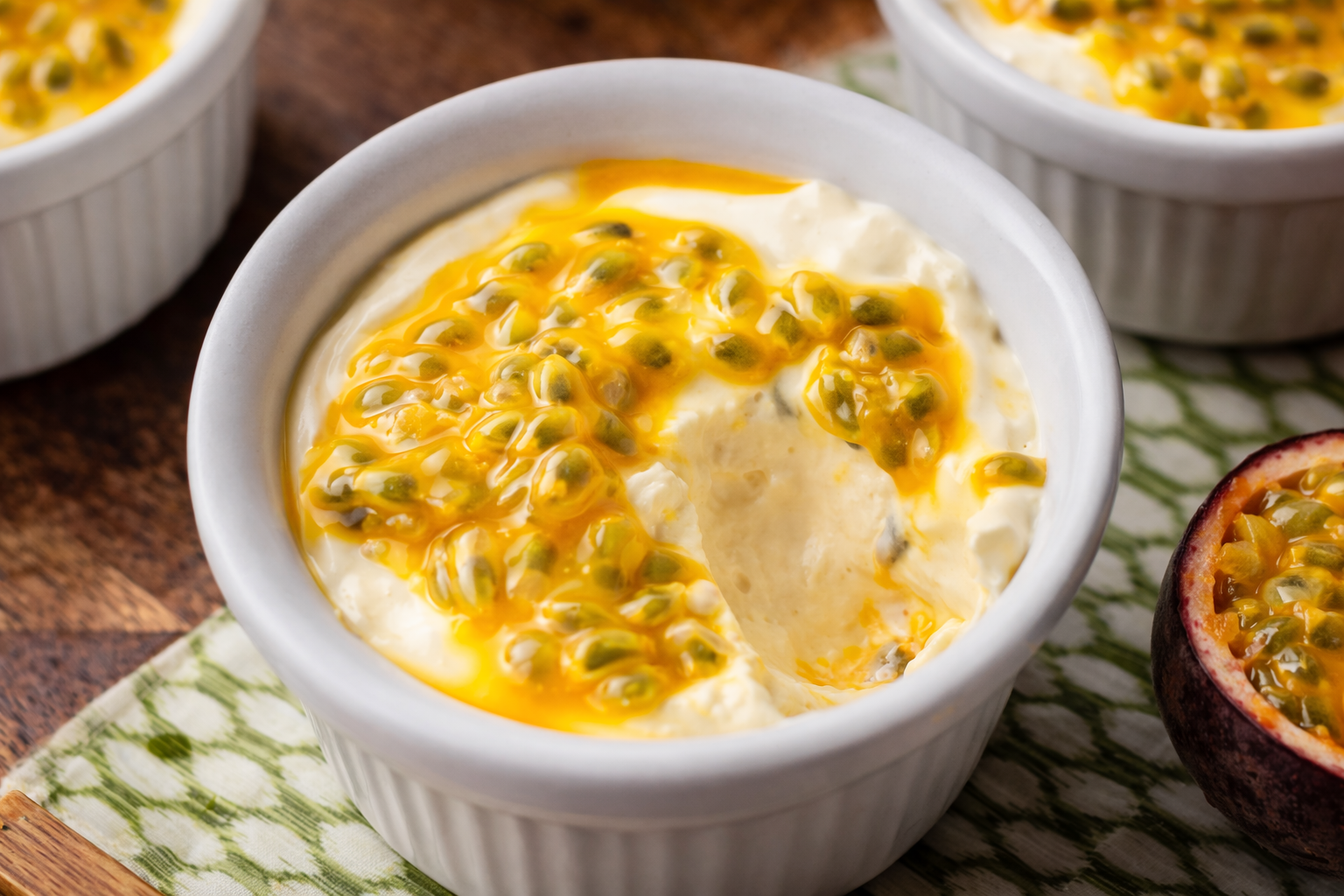 Noutra taça, bata as natas até obter picos firmes. Adicione a polpa de 3 maracujás e envolva novamente.