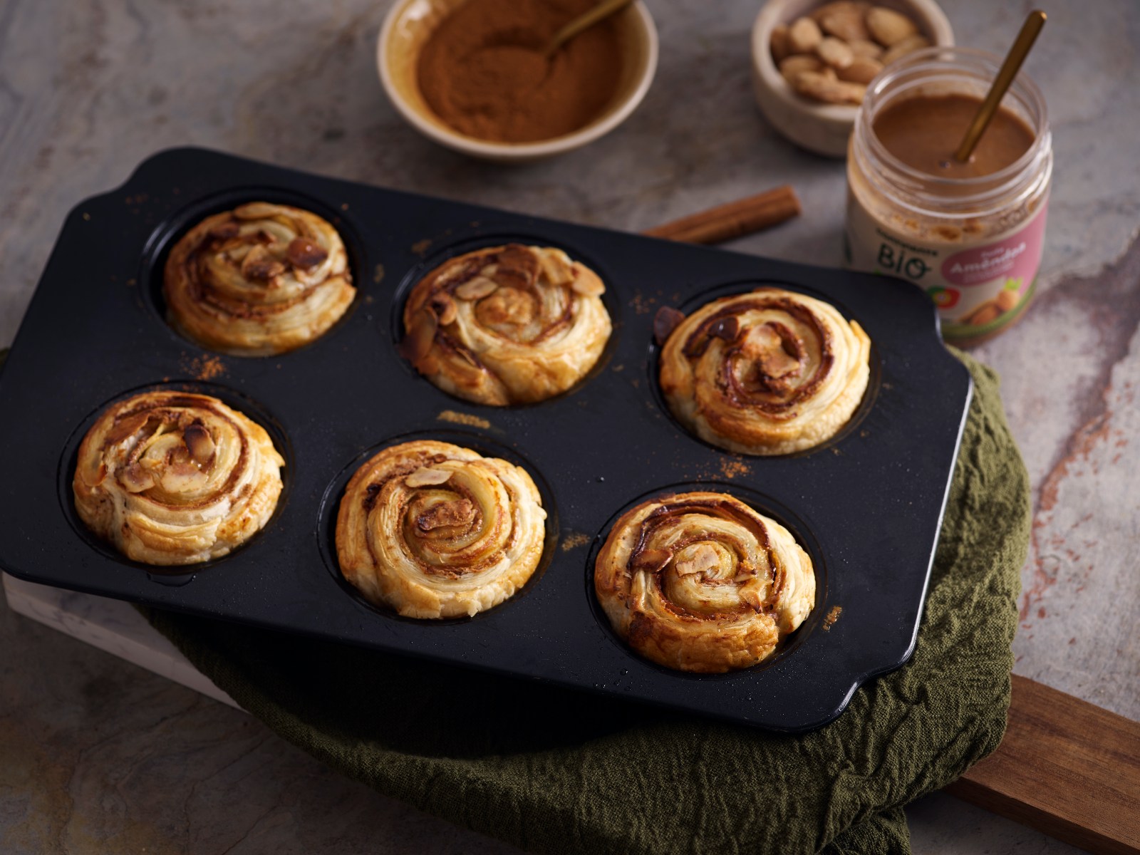 Estenda a massa folhada no tabuleiro e corte em 4 partes iguais.