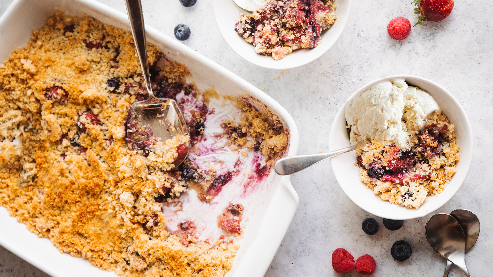 Comece por colocar os frutos vermelhos congelados numa taça grande e adicione a raspa e o sumo de 1 limão. Com um esmagador, esmague bem a fruta.