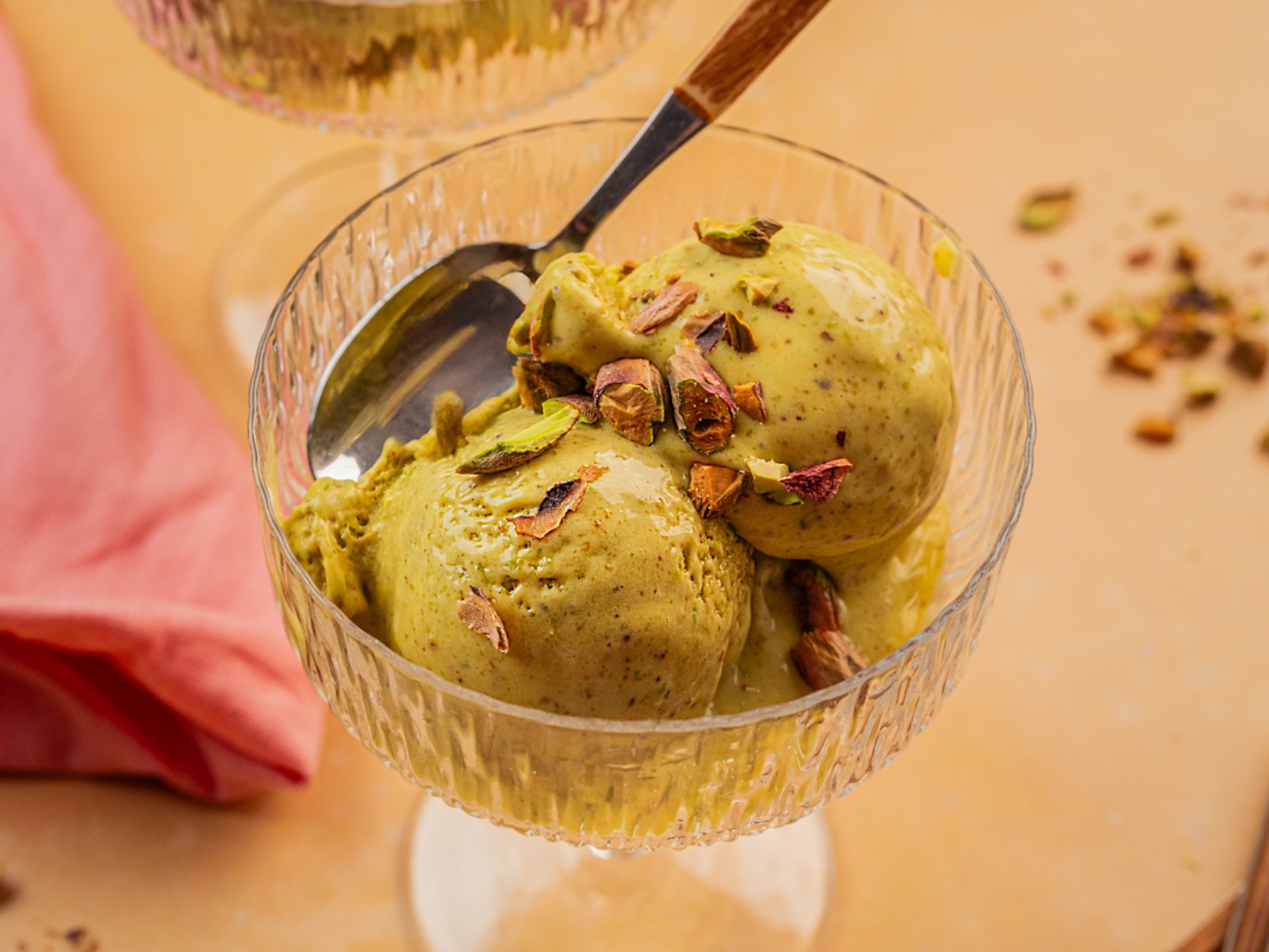 Sirva o gelado de pistácio polvilhando mais pistácio picado por cima.