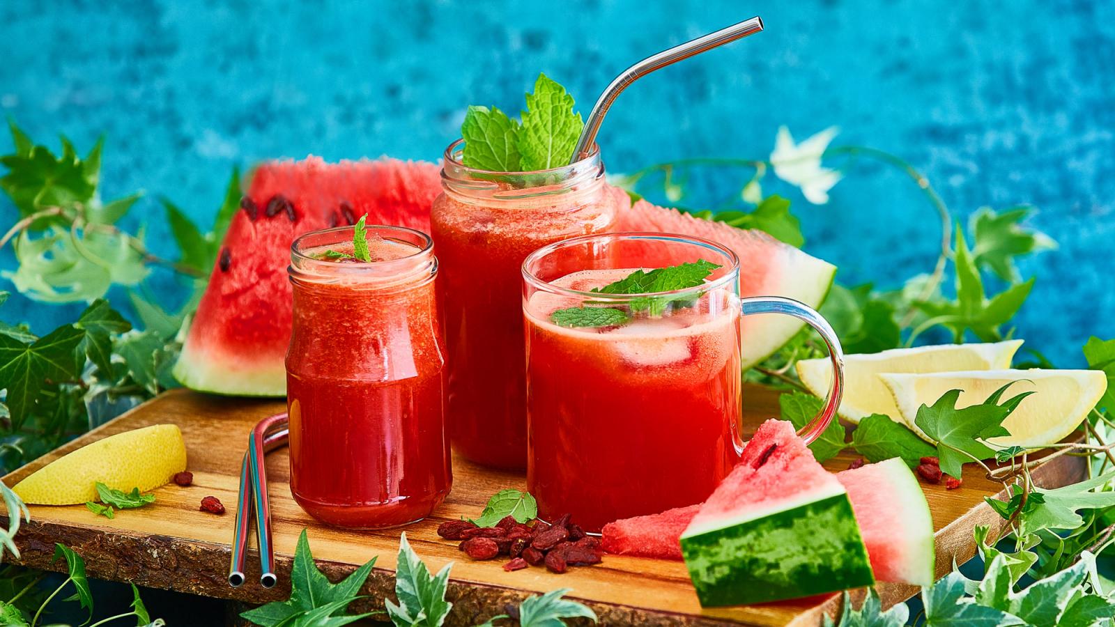 Adicione os frutos congelados, cubos de gelo e a hortelã e triture até ficar homogéneo.