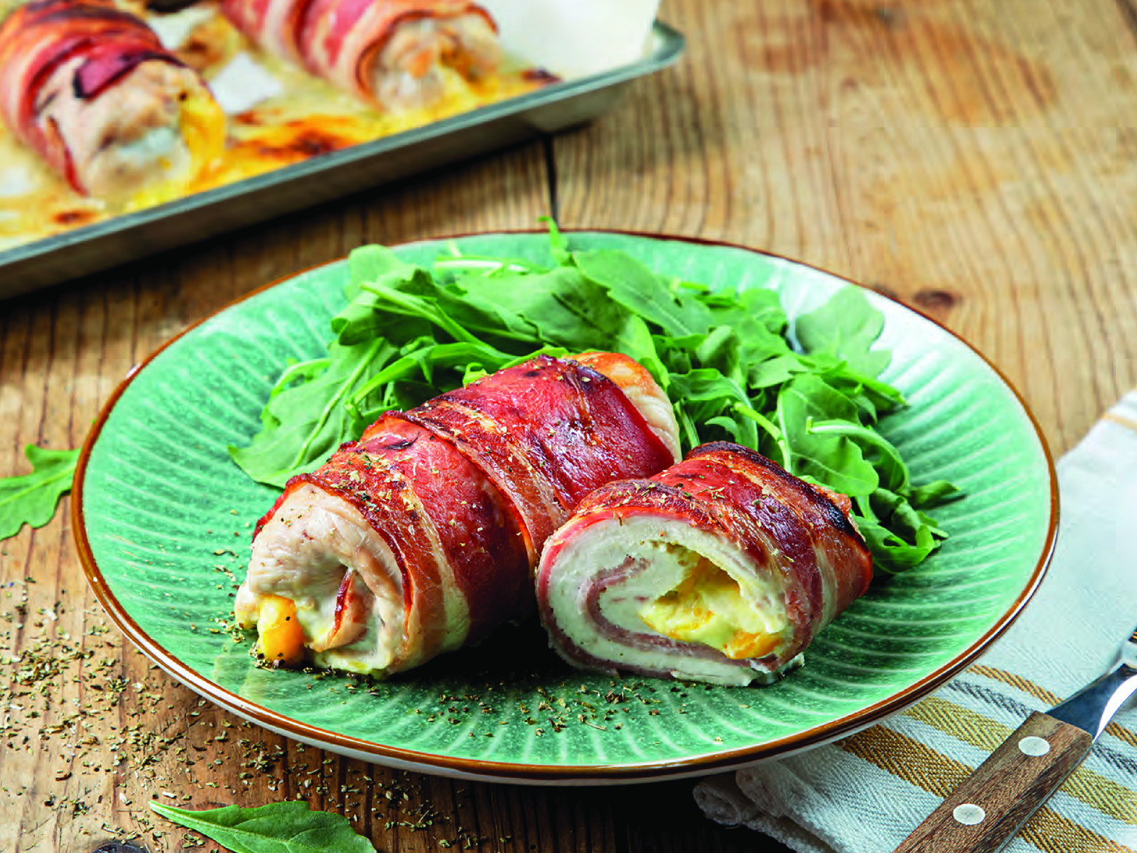 Disponha as fatias de bacon num tabuleiro forrado com papel vegetal. Leve ao forno a 180ºC por 10 a 15 minutos até ficar bem dourado e crocante.