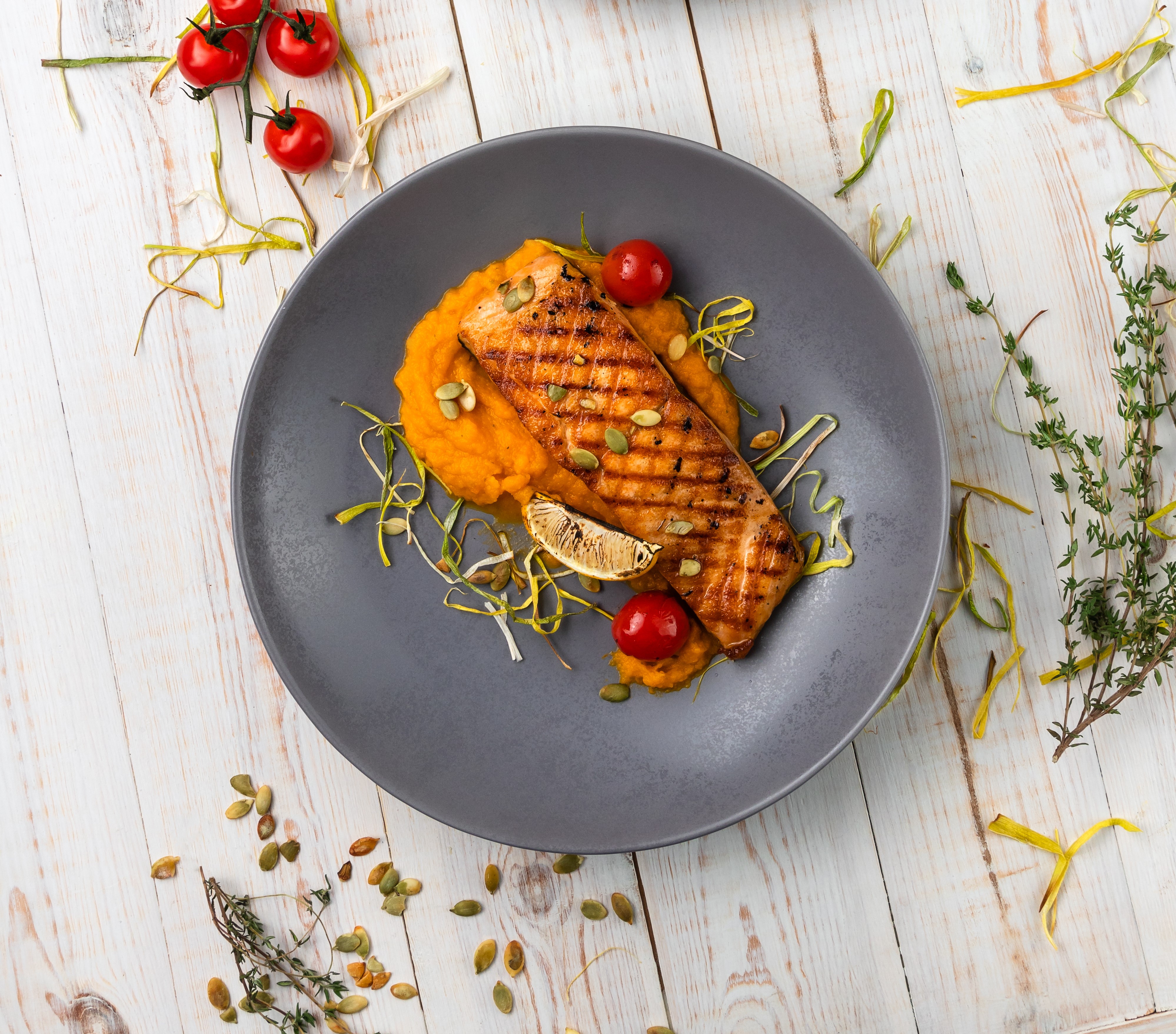 Sirva o pargo juntamente com as batatas e a curgete e finalize decorando com tomilho e alecrim a gosto.