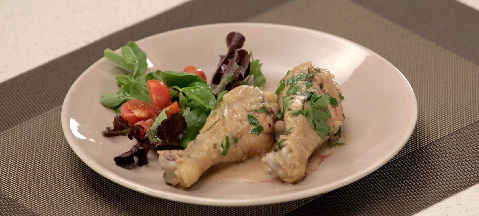 Fazer uns pequenos cortes nas perninhas de frango e temperá-las com sal e pimenta. Colocar no tacho com o azeite e deixar corar ligeiramente.