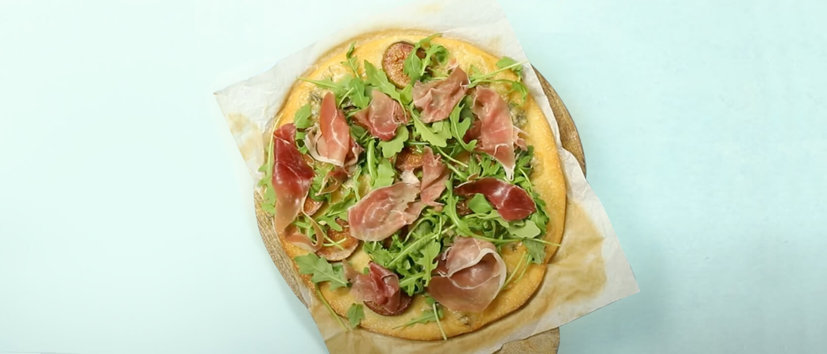 Retire do forno e coloque as fatias de presunto e polvilhe com as folhas de rúcula. Regue com um fio de azeite e um fio de creme balsâmico.