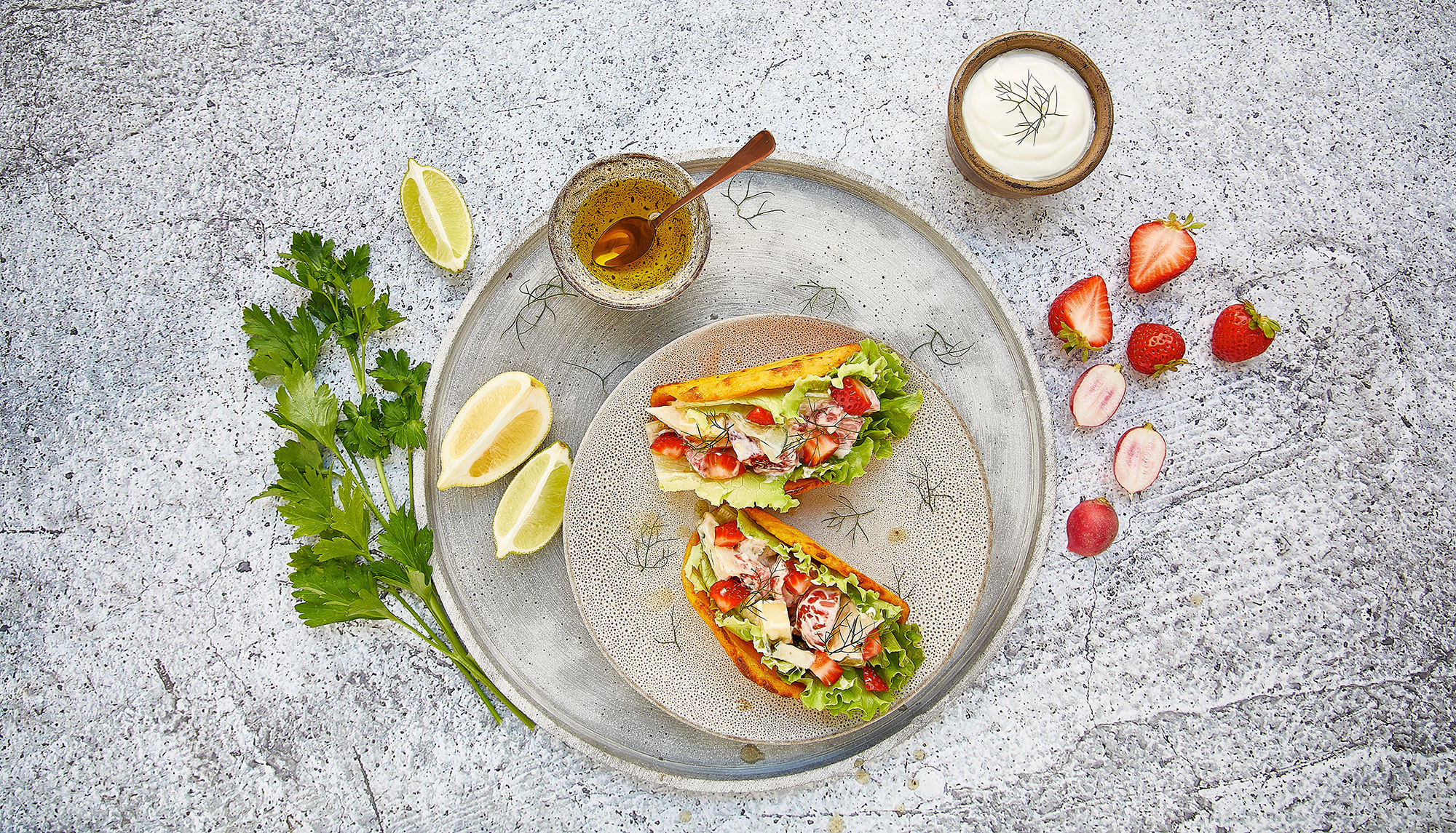 Numa tigela, bata os ovos e junte o iogurte grego natural. Tempere com sal e pimenta. Reserve.