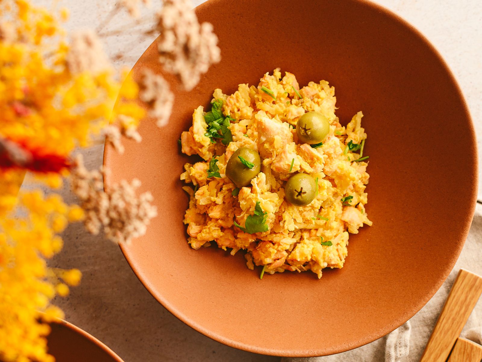 Numa taça bata ligeiramente os ovos juntamente com a bebida vegetal de aveia, e junte-os ao preparado de salmão.