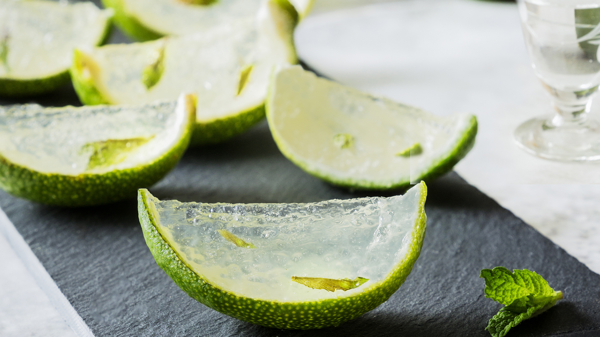 Decore com fatias de lima, hortelã fresca e polvilhe com açúcar em pó.