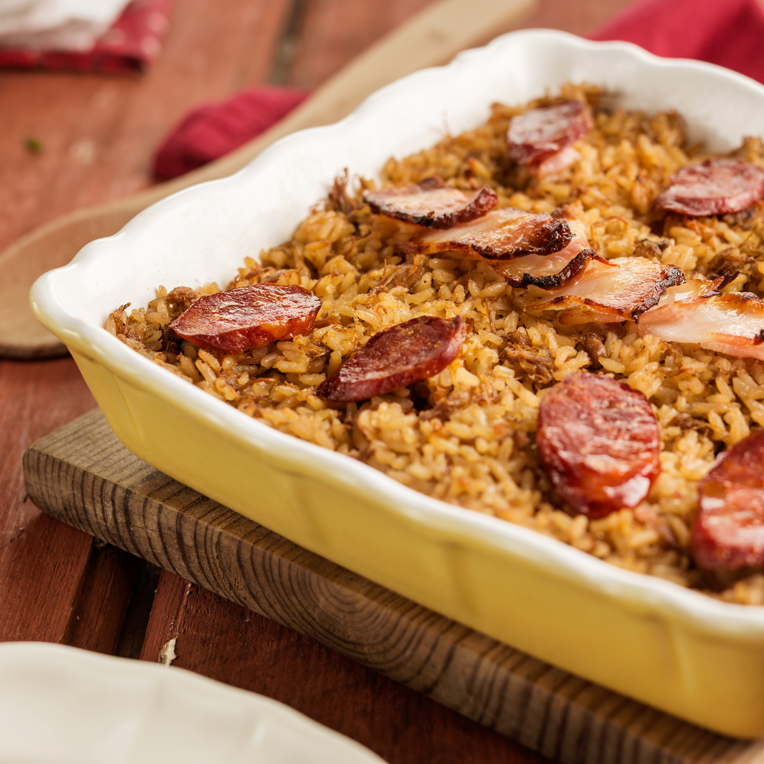 Num recipiente, misture o arroz e pato e disponha-o num pirex. Verta o de caldo da cozedura sobe o arroz e enfeite com as rodelas de chouriço e com o bacon.