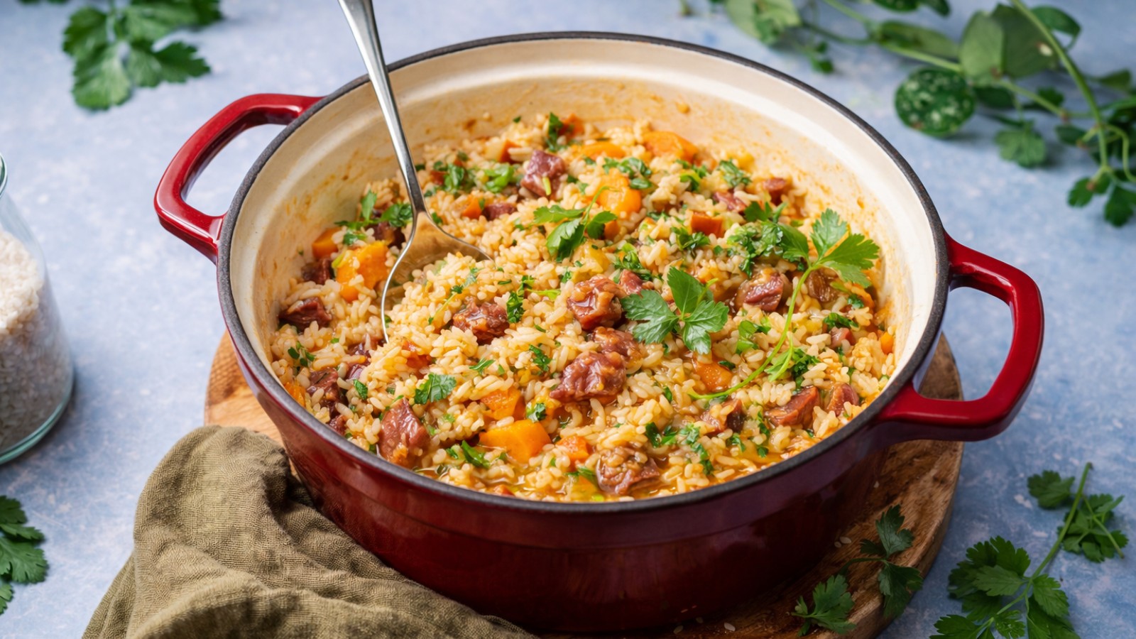 Sem lavar a panela, introduza a cebola aos pedaços e a salsa e pressione a Função Triturar. Com a espátula, faça descer os pedaços acumulados nas paredes da panela e volte a carregar na Função Triturar.