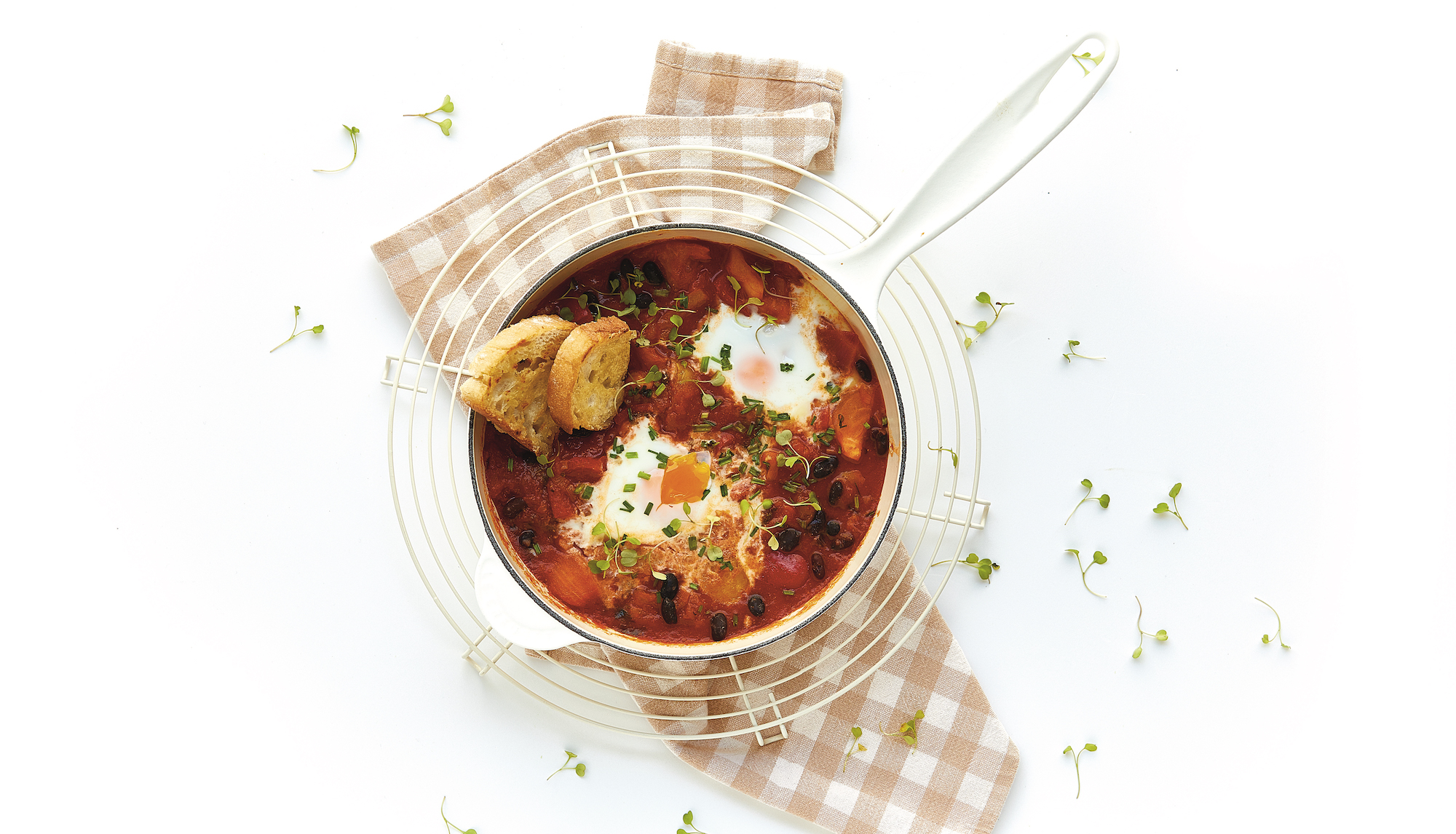 Transfira o preparado para duas frigideiras, junte o feijão e abra os ovos por cima. Leve ao forno durante 10 minutos.