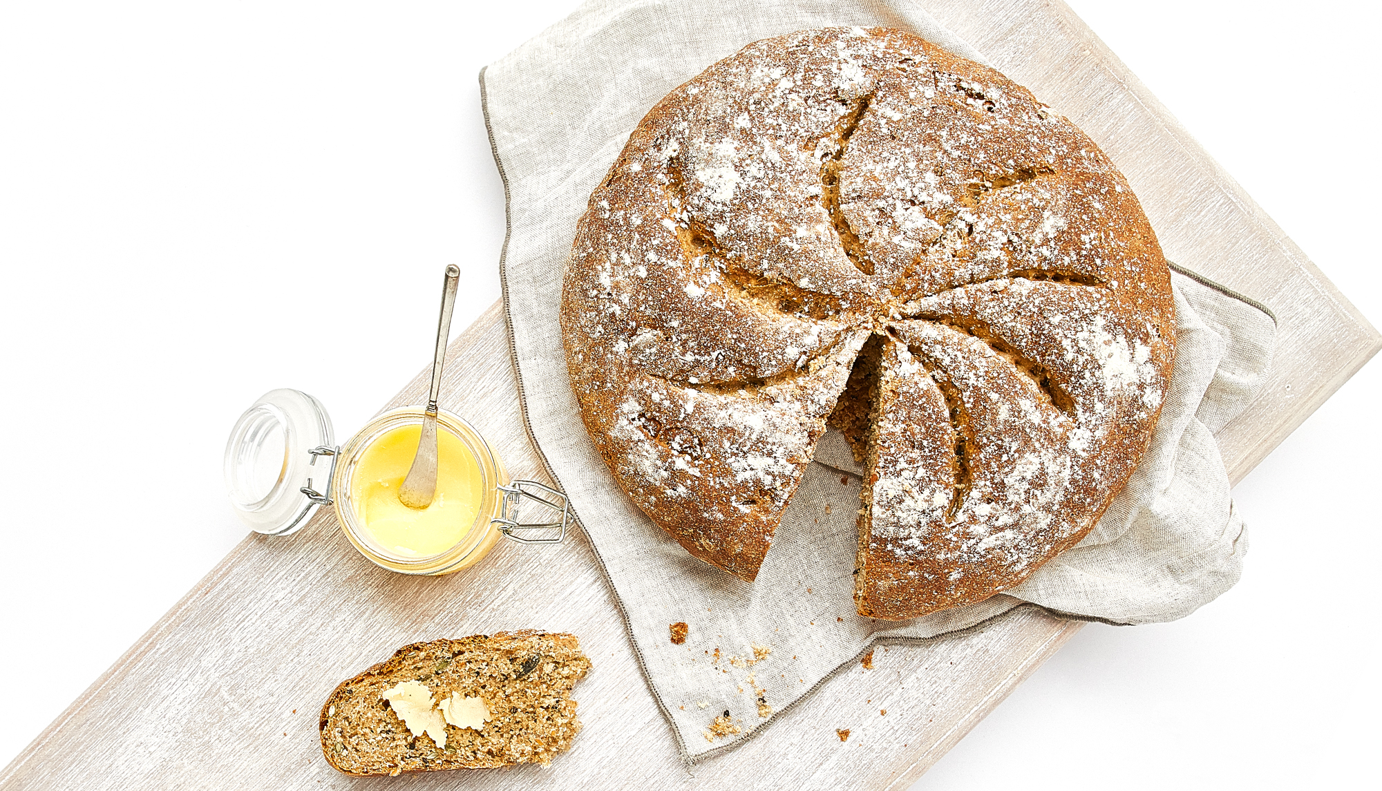 Sem retirar o pão do tabuleiro e tocando-lhe o menos possível, faça alguns cortes na superfície. Borrife levemente a superfície do pão com água (vai ajudar a obter um crosta mais crocante) e leve ao forno durante 30 a 40 minutos.