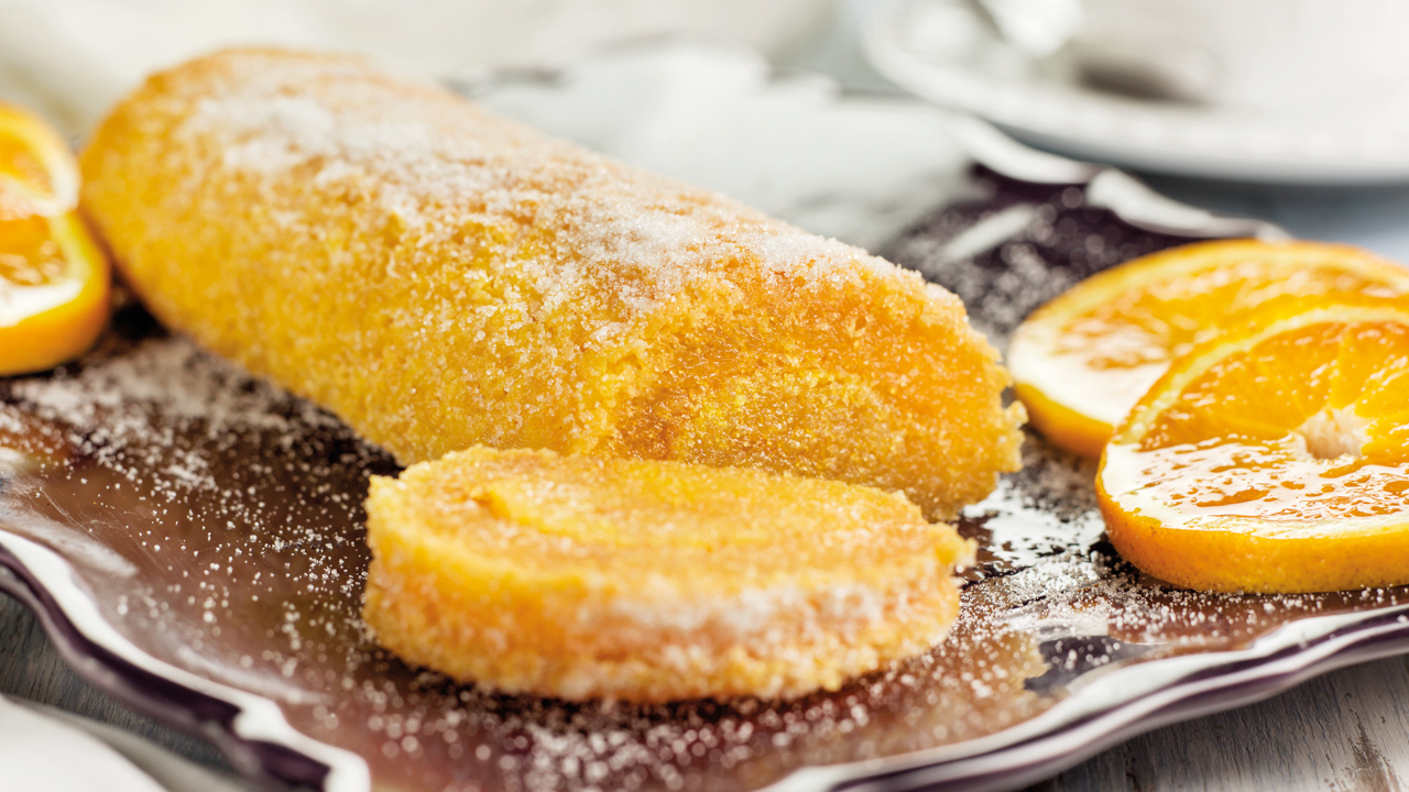 Desenforme, ainda quente, sobre uma folha de papel vegetal polvilhada com açúcar e enrole cuidadosamente.